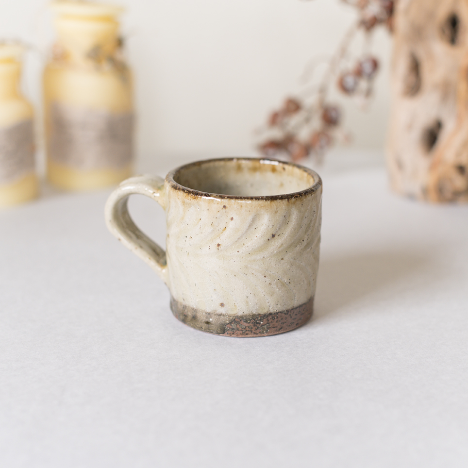 伝統技術と現代感覚が見事に調和した「しのぎアジロマグカップ」。控えめなアジロ模様と素朴な色味が、手作りならではの温かみを感じさせます。手に馴染むサイズ感と使いやすい取っ手は、日常使いにぴったりです。