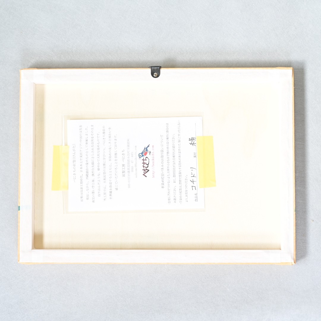 絹の生地に手染めで仕上げた紅型を、木製パネルに仕立てた一点もの。