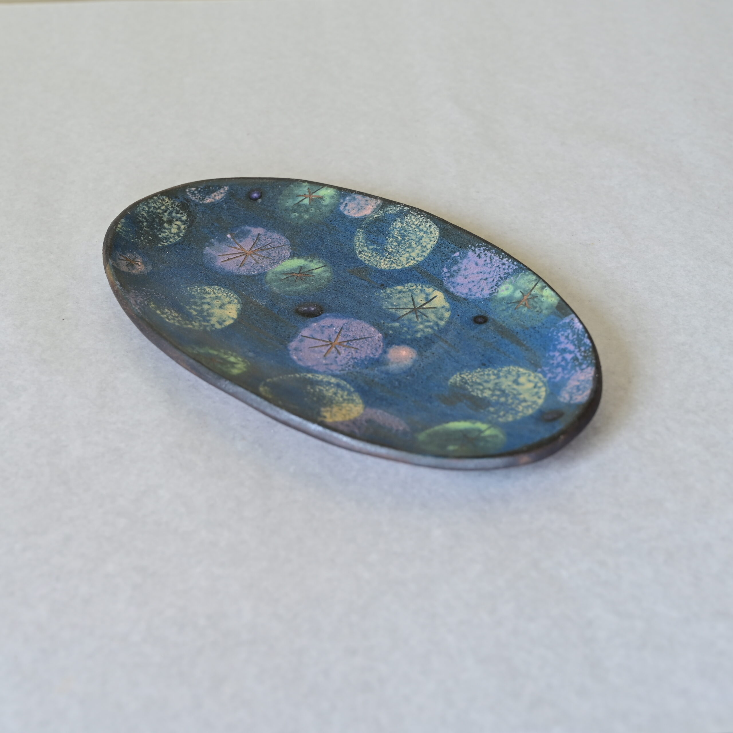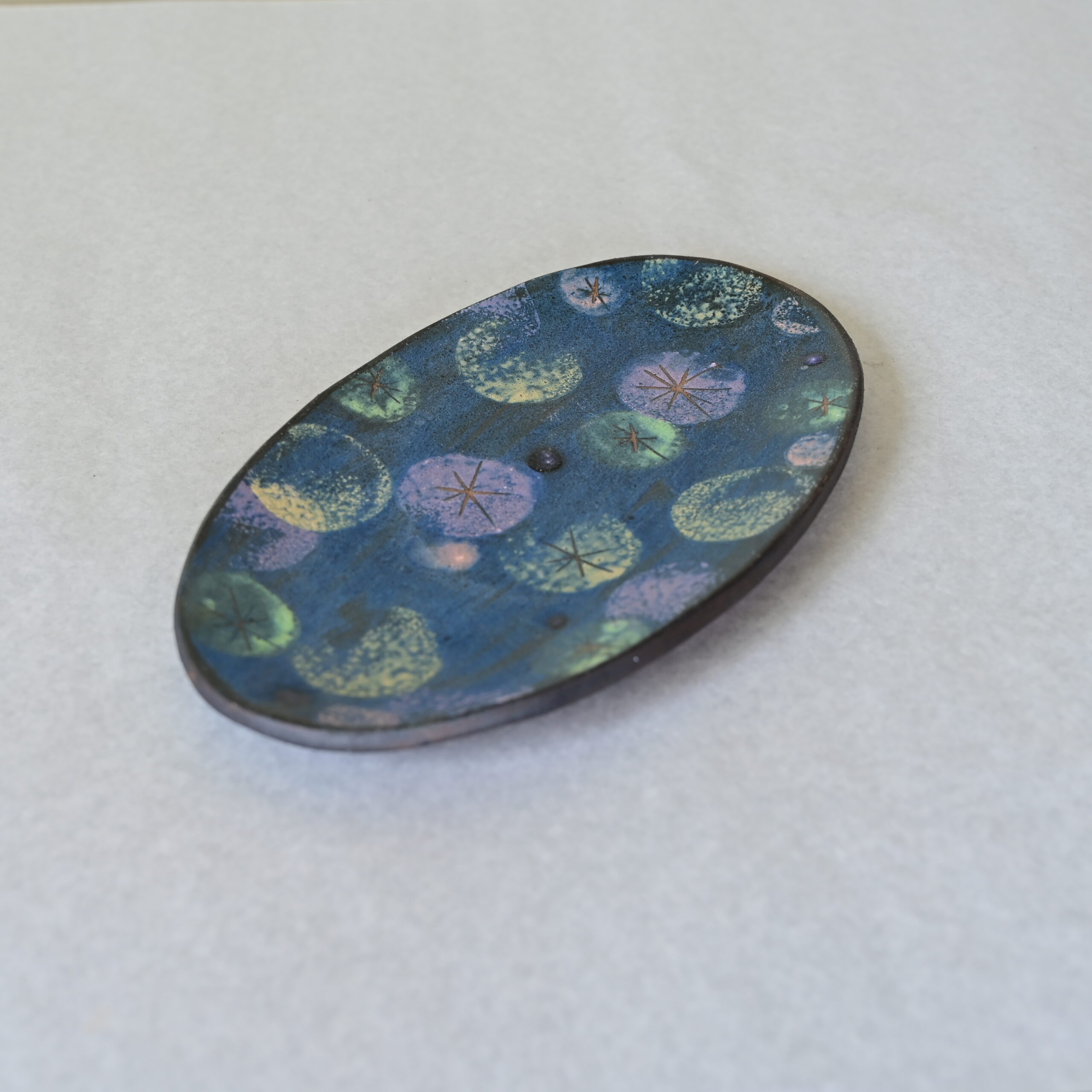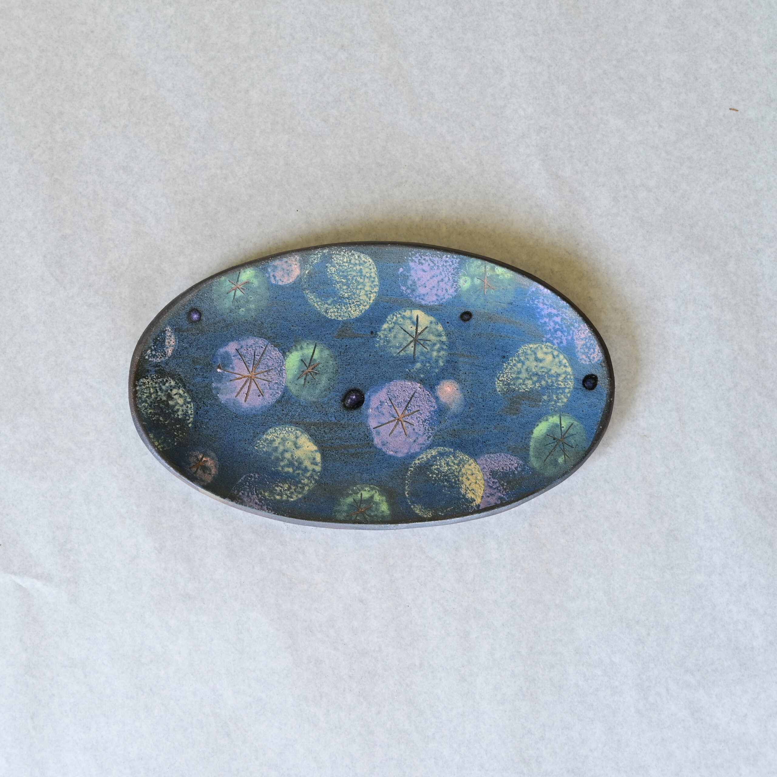このオーバル皿には、青を基調とした幻想的な色彩の中に、星のような文様が浮かびあがる世界が広がっています。