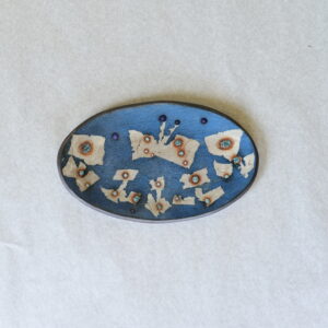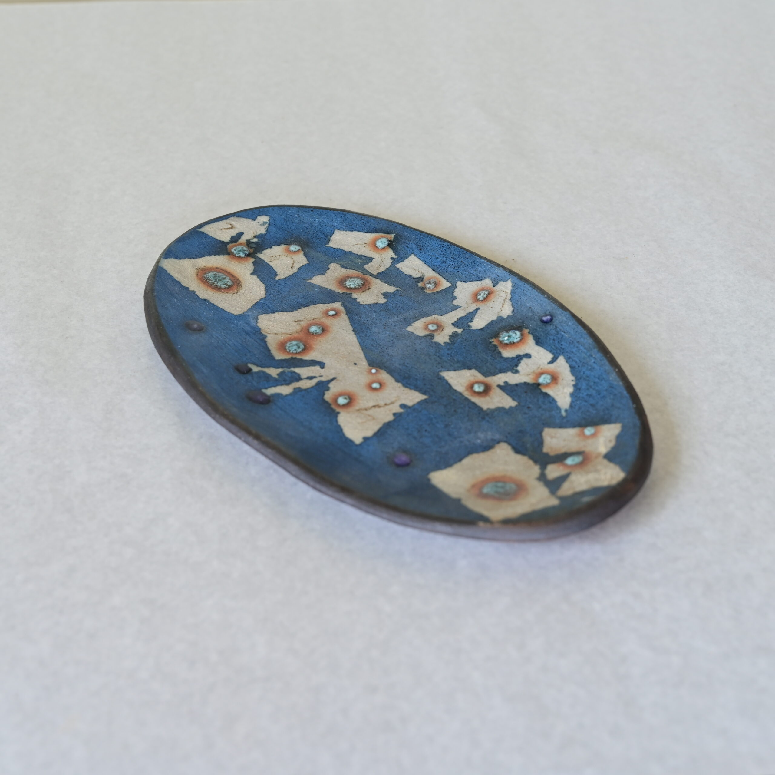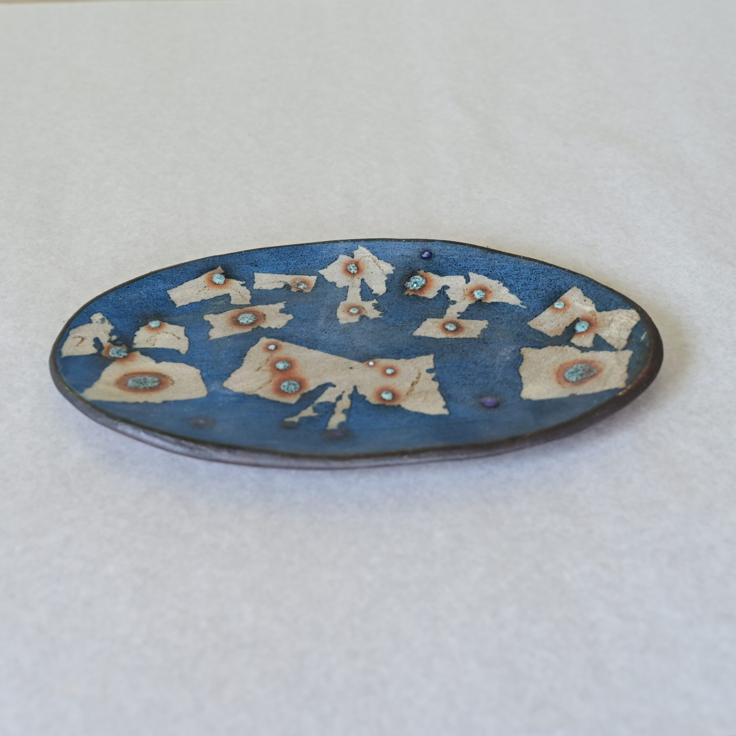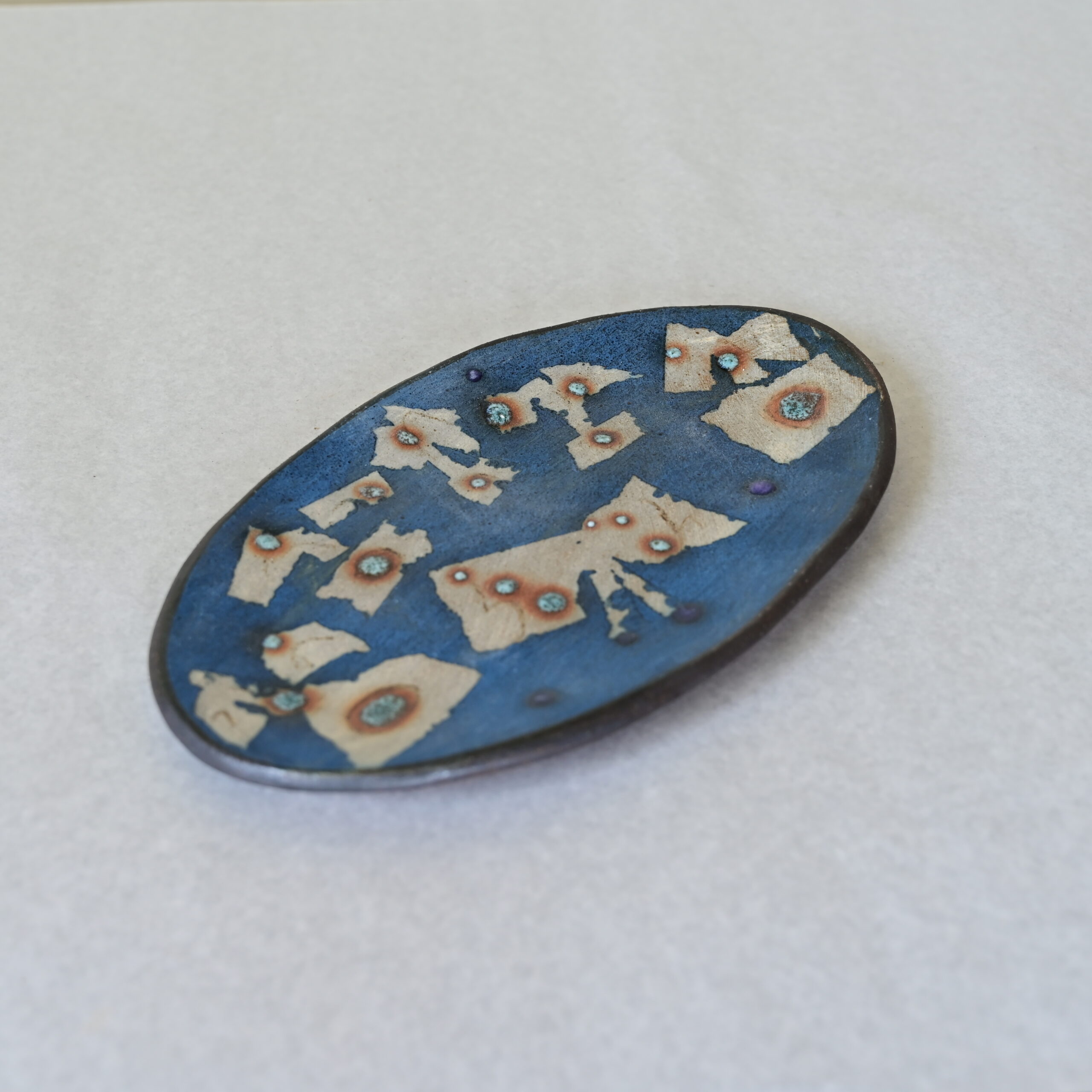 このオーバル皿には、青を基調とした幻想的な色彩の中に、星のような文様が浮かびあがる世界が広がっています。