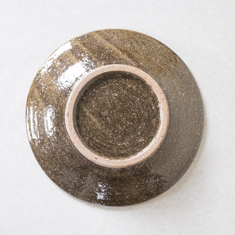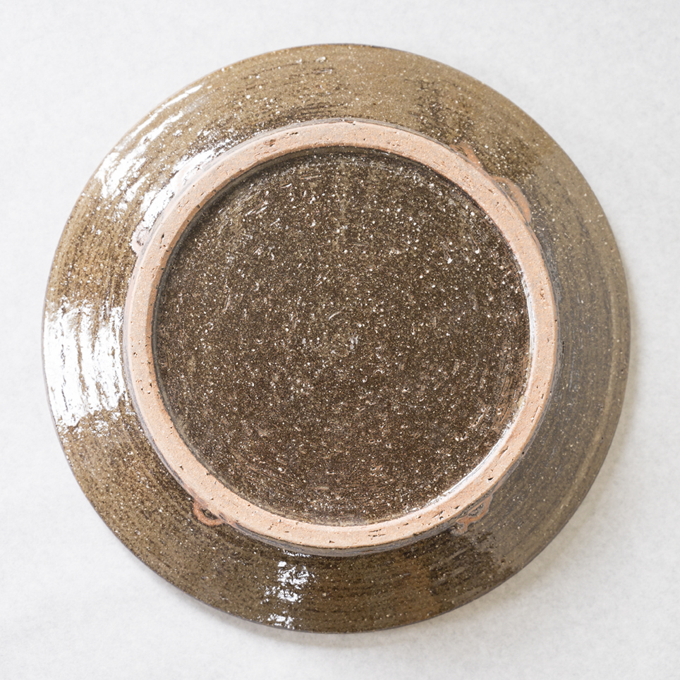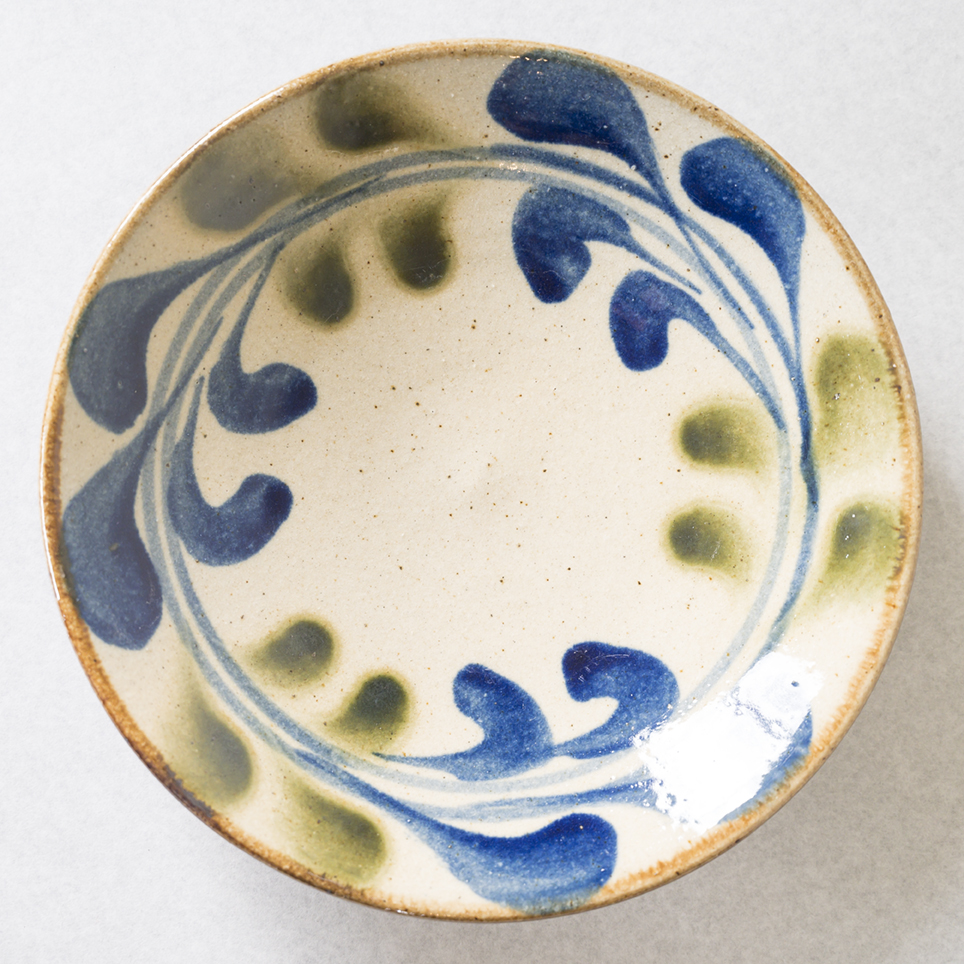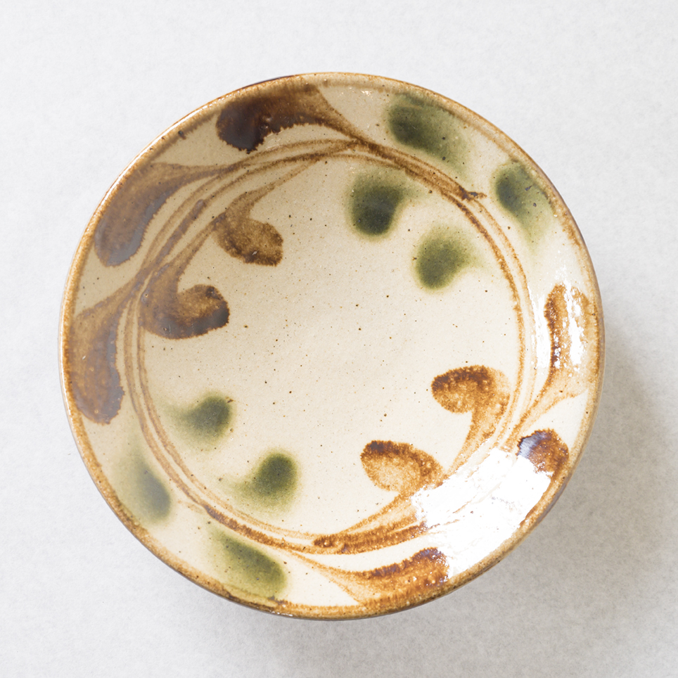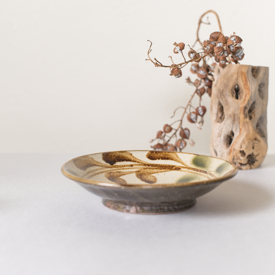 デイゴの葉と花をイメージした模様が、柔らかい緑と茶色の自然な色合いで描かれています。軽やかな筆使いが、器全体に生命力を与えています。