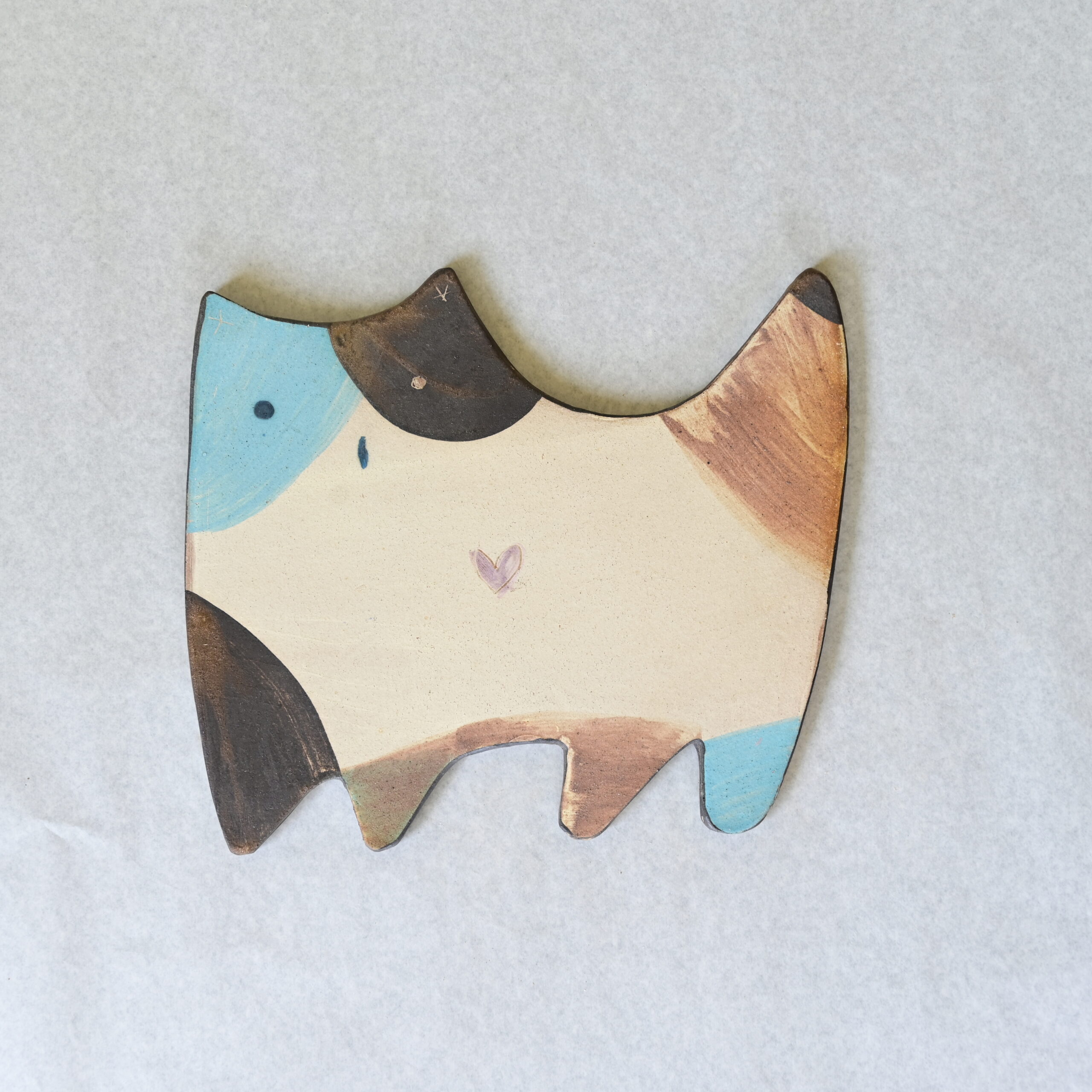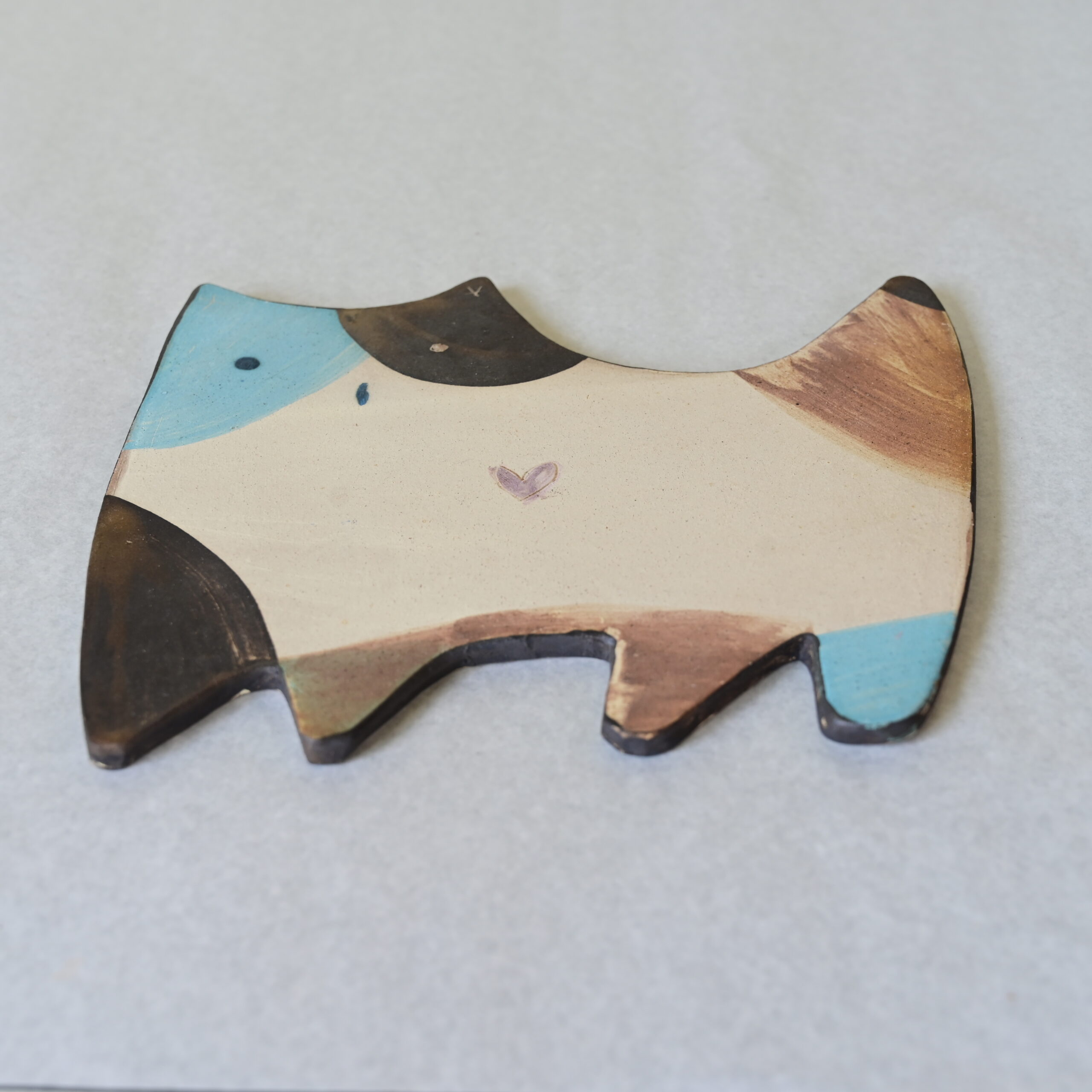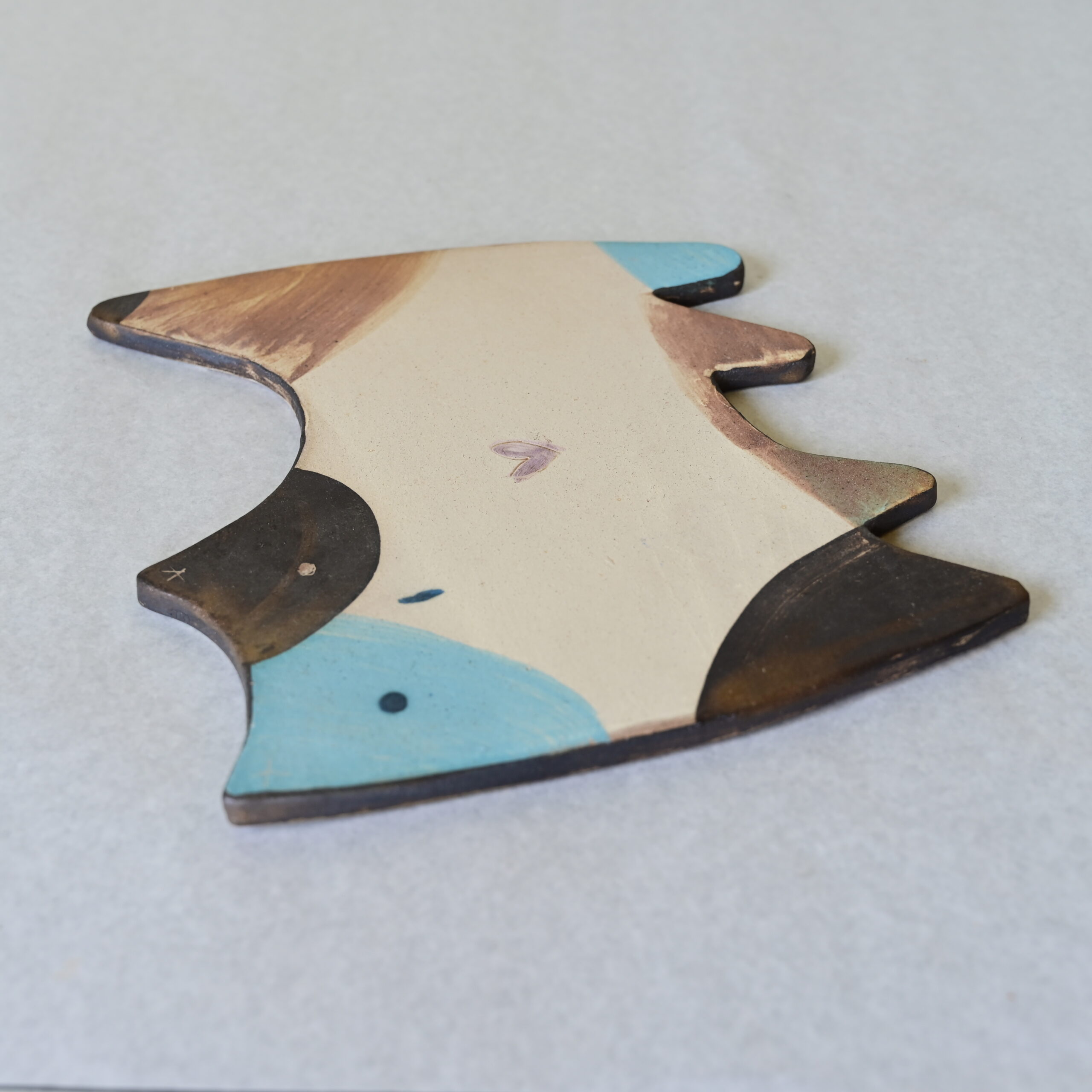 おなかはふっくら、足取りはしっかり。背中はフラットで、まっすぐ前を見つめているような姿が印象的な“ねこのかたち”のお皿です。色とりどりの模様が手描きされ、裏面には植物模様とほほえむような顔の線描が施されています。見えないところにも、作り手のユーモアと愛が詰まった一枚。