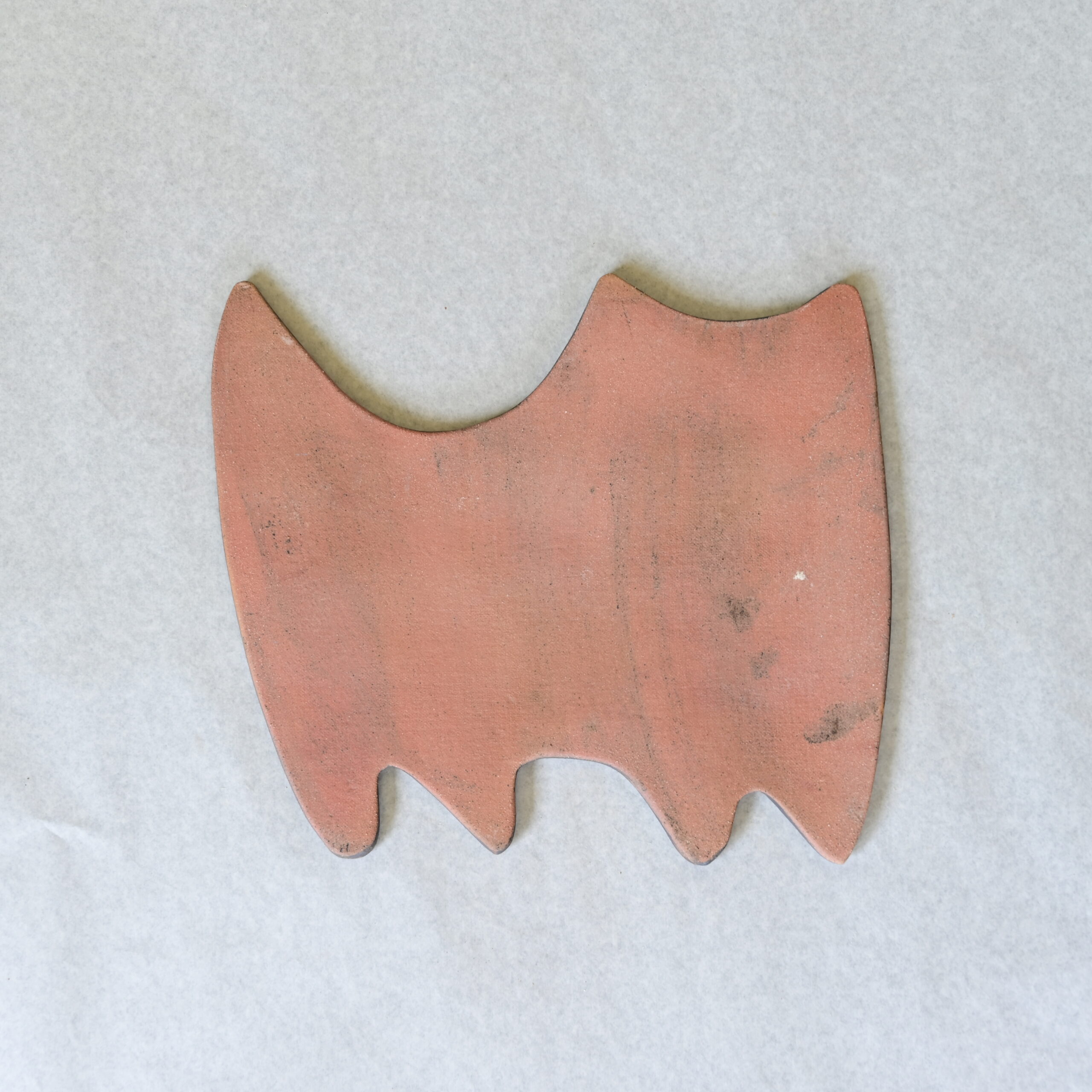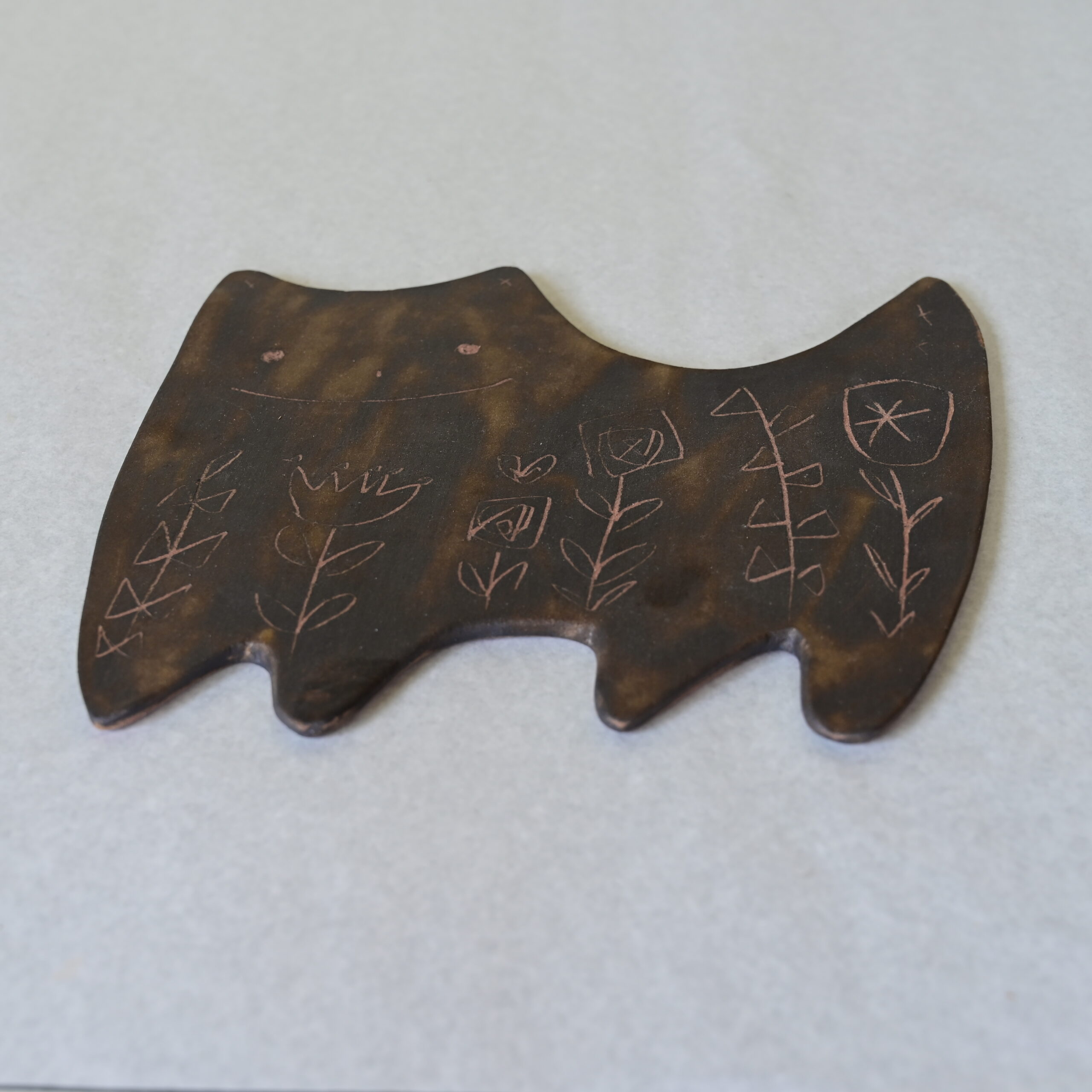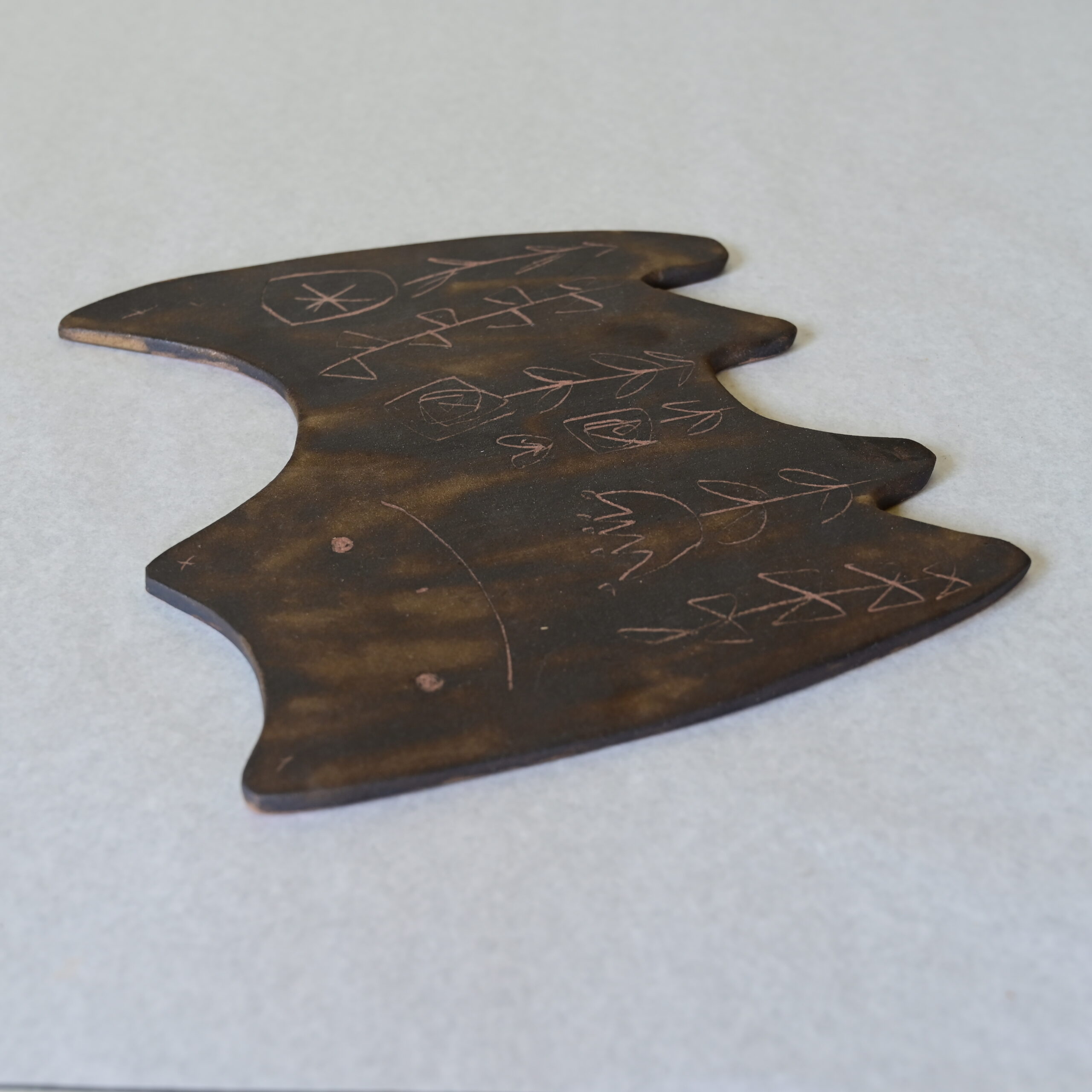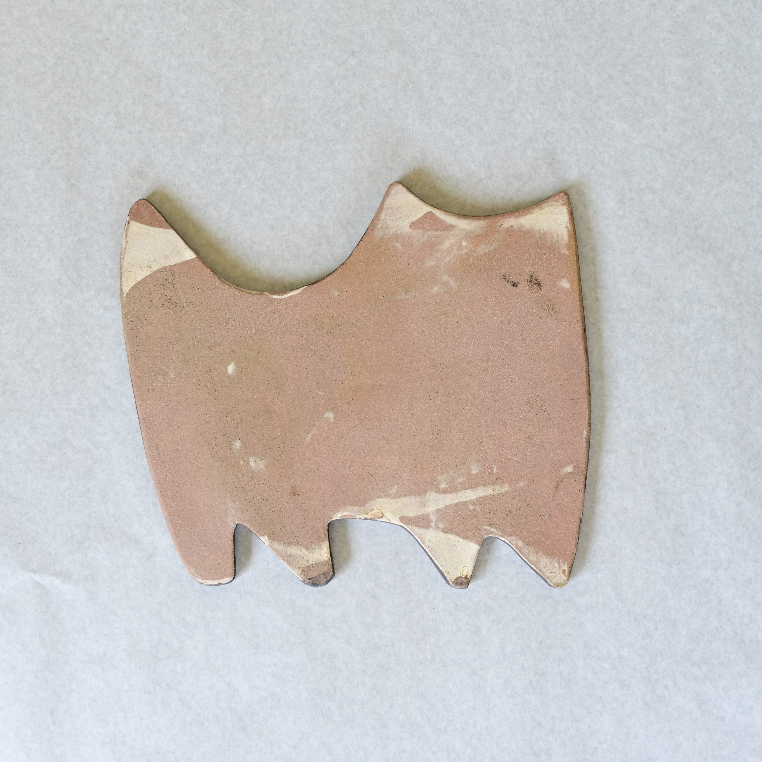 おなかはふっくら、足取りはしっかり。背中はフラットで、まっすぐ前を見つめているような姿が印象的な“ねこのかたち”のお皿です。色とりどりの模様が手描きされ、裏面には植物模様とほほえむような顔の線描が施されています。見えないところにも、作り手のユーモアと愛が詰まった一枚。