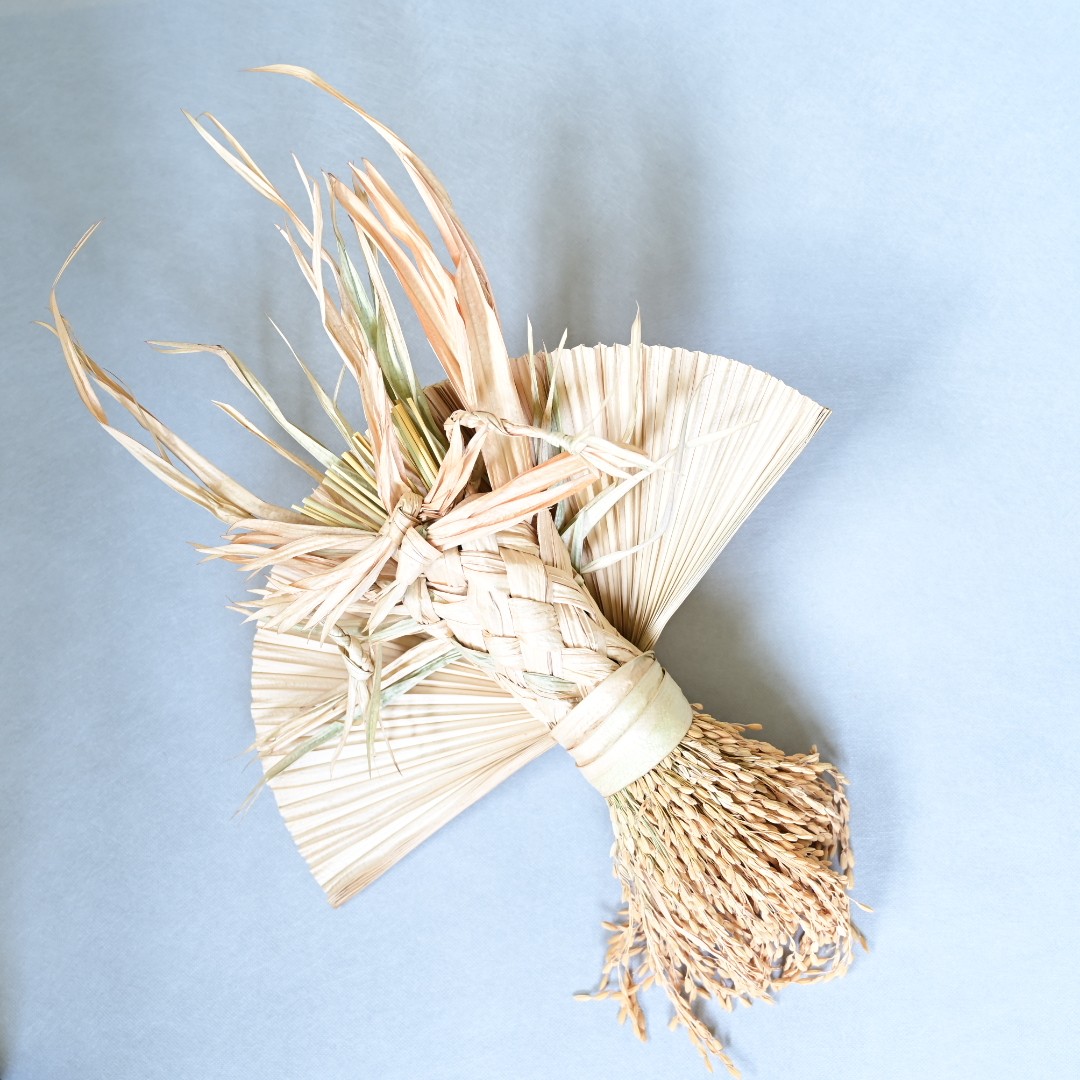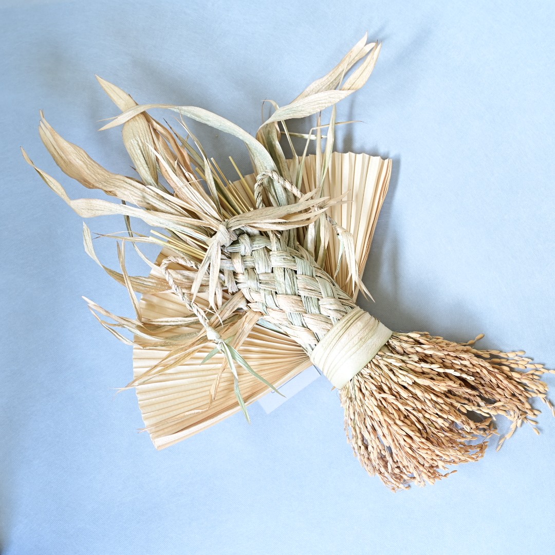 この飾りには、伊平屋島ならではの素材がふんだんに使われています。編み込まれたクバ(ビロウの葉)は、島の自然が育んだ強さとしなやかさを象徴し、長寿や繁栄を願う意味が込められています。また、お米は伊平屋島産のものを使用しており、豊作や実りへの感謝と祈りを込めた仕上がりです。