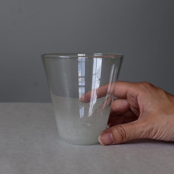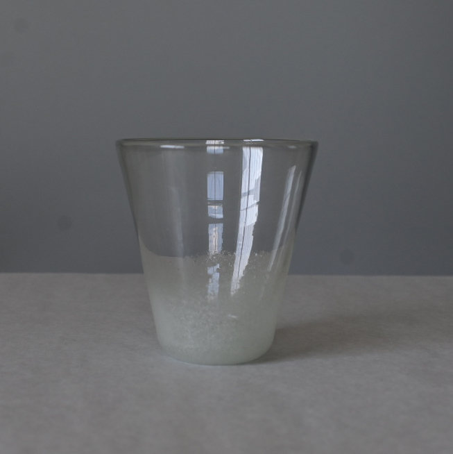 再生ガラスを使用し、熟練した職人の手吹き技法によって一つひとつ丁寧に作られたこのグラスは、名前の通り、雲間から光が差すような幻想的なデザインが魅力です。透明なガラスに柔らかい白の模様が浮かび上がり、グラス全体に繊細で上品な雰囲気を与えています。