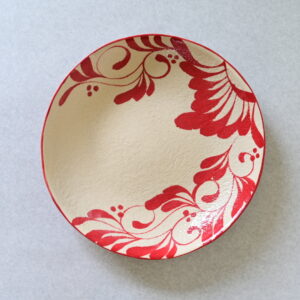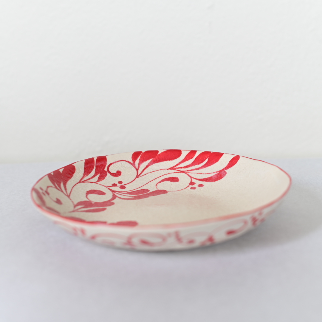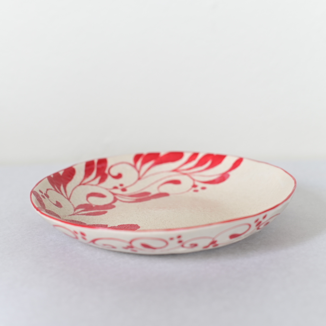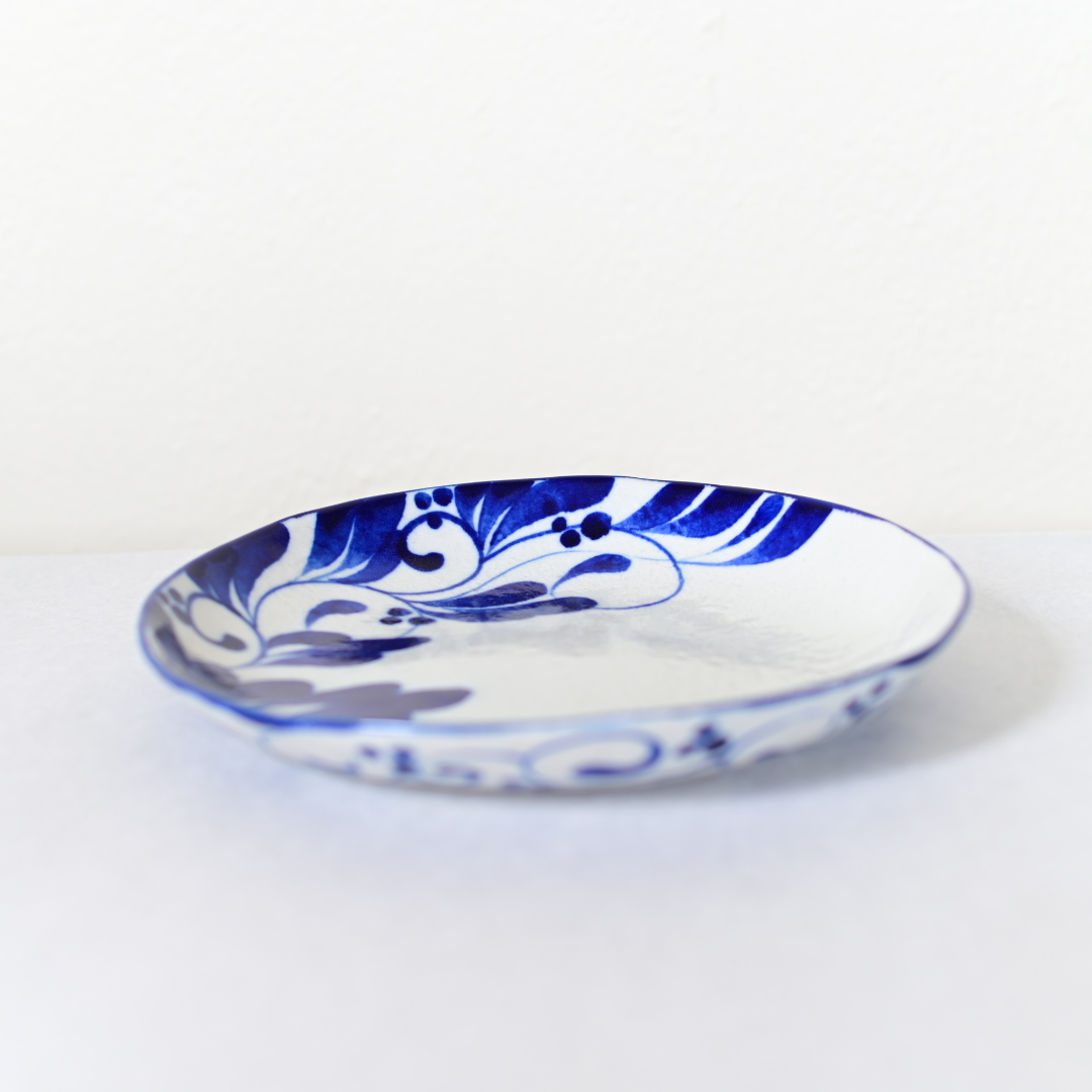 眞正陶房の器、直径約21cmのプレート。安里貴美枝による巧みな筆遣いで一面に描かれる美しいコバルト色と赤色の唐草模様が印象的な一枚。
