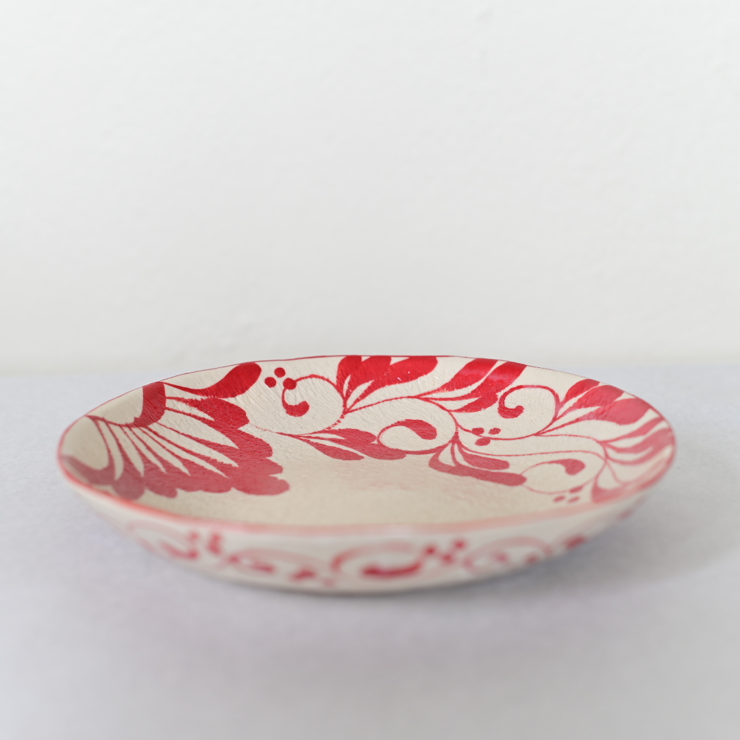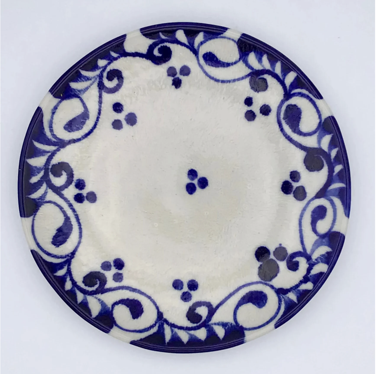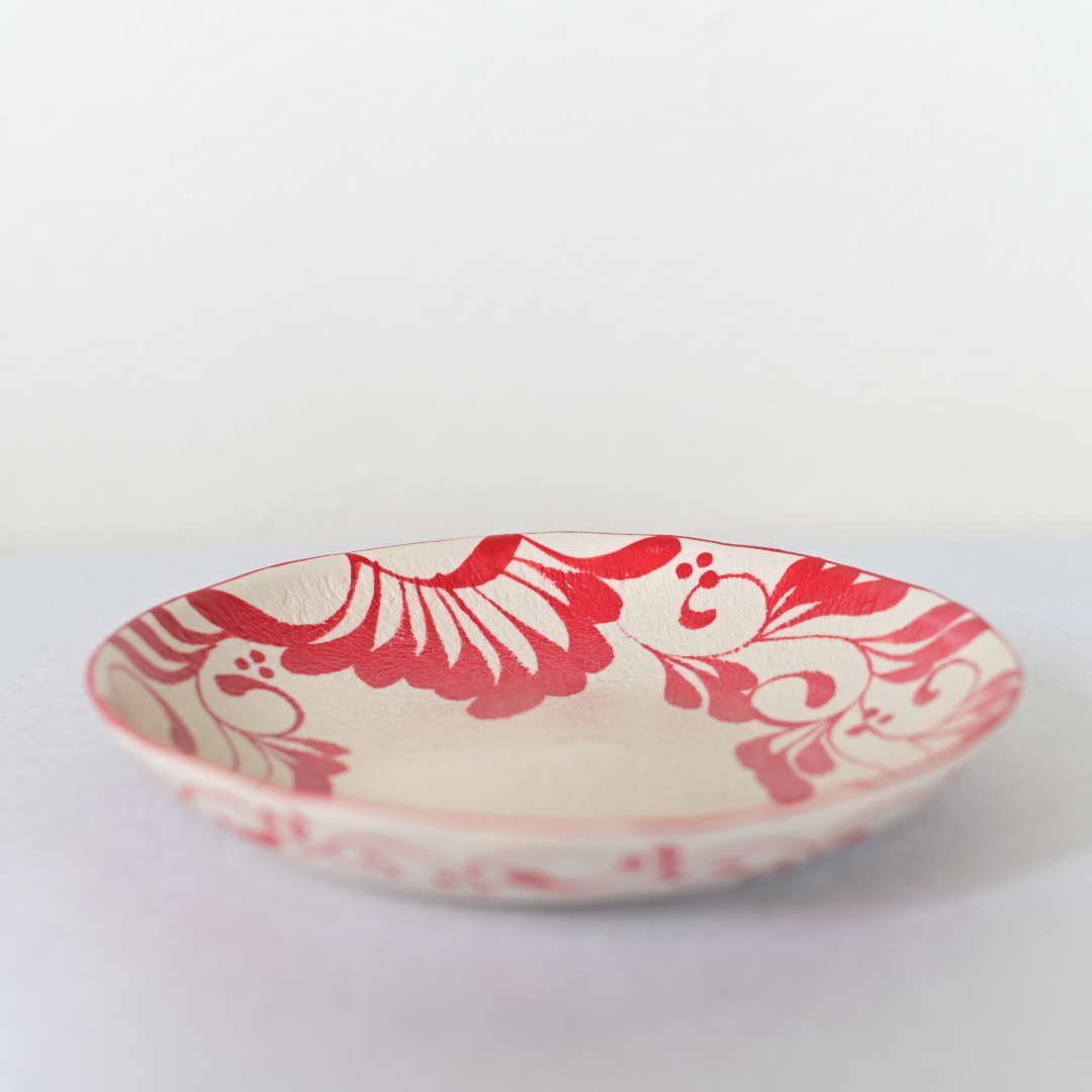 眞正陶房の器、直径約21cmのプレート。安里貴美枝による巧みな筆遣いで一面に描かれる美しいコバルト色と赤色の唐草模様が印象的な一枚。